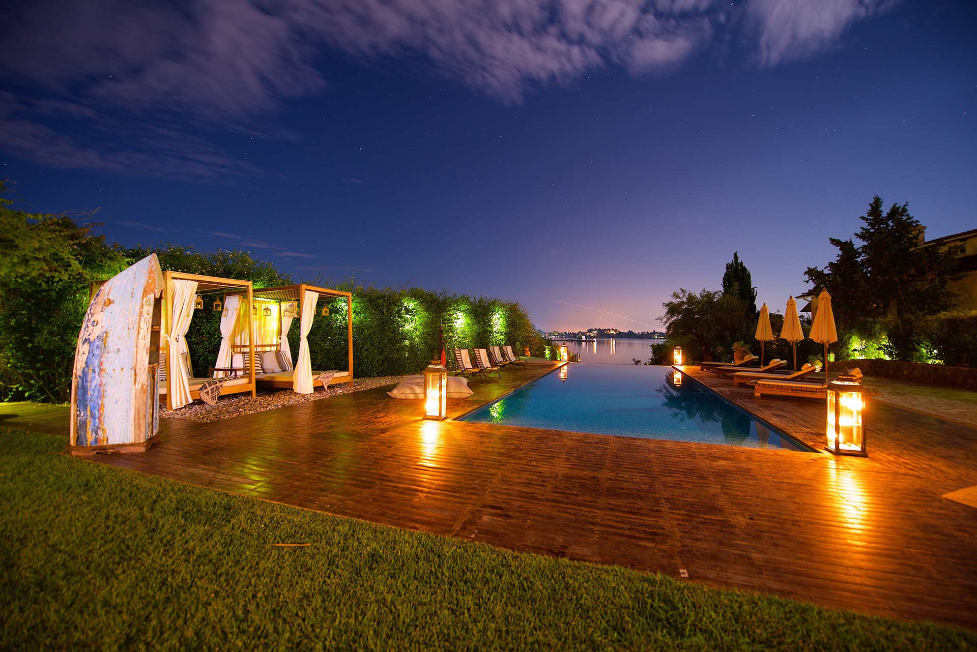 Ο προαύλιος χώρος του Μ΄έλαμπες αναπτύσσεται σε τρία διαφορετικά επίπεδα, δημιουργώντας ένα μοναδικό σκηνικό που προσφέρει επιλογές για κάθε είδους εκδήλωση. Μια πισίνα με θέα στο Ιόνιο, ιδιωτική πρόσβαση στη θάλασσα και ευρύχωρες επιφάνειες για φαγητό, χορό και χαλάρωση συνθέτουν ένα περιβάλλον απόλυτης αισθητικής και άνεσης. Κάθε σημείο του χώρου έχει σχεδιαστεί με σεβασμό στο τοπίο και με γνώμονα τη φυσική κομψότητα.